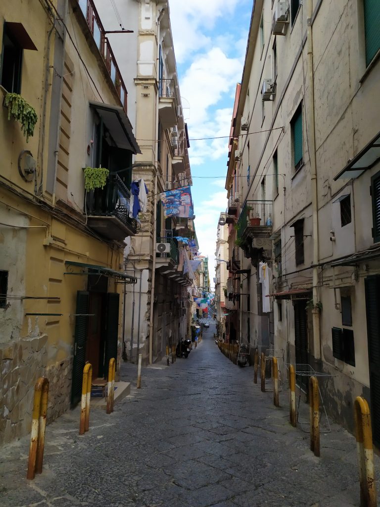 Die Anreise ging besser als erwartet. Wir stiegen um 13.30 Uhr in den Zug nach München und kamen dort pünktlich an. Nach einer kleinen Runde im Bahnhofsviertel zum Beine Vertreten kehrten wir auf Spätzle und Schweinebraten zum Hellen ein. Zwei Stunden später ging schon der Nachtzug nach Rom. Auch der war pünktlich und wir hatten ein 6er Abteil für uns allein. Der Zug war völlig überheizt. Schlafen war schwierig, weil die Sitzbank selbst für mich zu kurz war, aber es war möglich, sich langzulegen und nicht im Sitzen schlafen zu müssen. Die Nacht verging schnell, Störungen durch Kontrollen hielten sich an und in Grenzen. Rom erreichten wir mit 1,5h Verspätung. Das nahmen wir locker, weil wir keinen Anschlusszug gebucht hatten. Zwei Stunden später kamen wir in Neapel mit einem Regionalzug an und begaben uns auf die Suche nach unserem Quartier. Nach einer halben Stunde hatten wir es gefunden und wurden von Fabio, unserem Gastgeber, begrüßt, beschenkt und mit vielen Tipps versehen. Wir erkundeten noch die Umgebung und kehrten ins empfohlene „Starita“ ein. Ich aß zum ersten Mal frittierte Pizza. War köstlich. Als wir gegen halb neun die Pizzeria verließen, war draußen eine lange Schlange, so beliebt ist das hier.