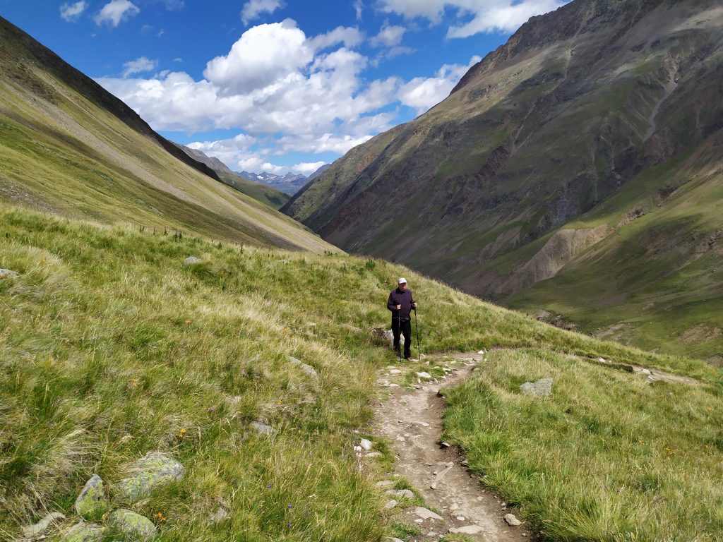 Ein Mix aus Sonne und Wolken begleitete uns auf der dreistündigen Tour zum Hochjoch Hospiz. Wir überwanden 500 Höhenmeter und kamen dabei gut ins Schwitzen. Auf der sonnigen Terrasse aßen wir einen kleinen Imbiss und tranken gespritzten Johann. Nach einer Stunde Mittagspause traten wir den Rückweg an. Für den brauchten wir weniger als drei Stunden, kehrten aber in Rofen noch einmal auf ein Getränk ein. Wir spürten unsere Beine gut und stimmten darin überein, dass die Startwanderung gut gelungen war.
