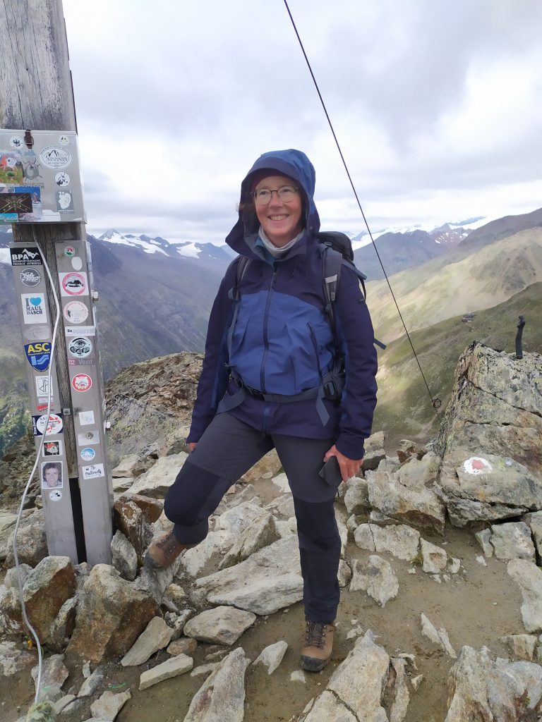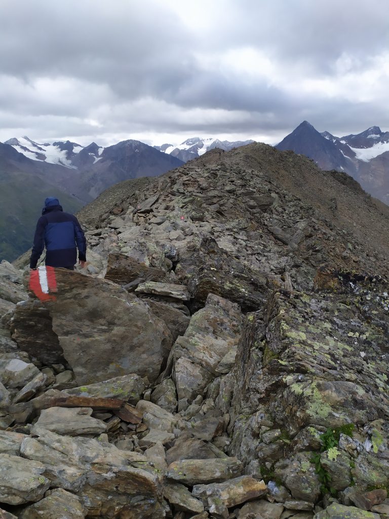 Wir hatten trockenes Wetter mit Sonne und Wolken Mix! Zunächst liefen wir durch ein ehemaliges kleines Gletschertal, dann über einen Ritsch (Gletscher Moräne) hinauf mit angenehmer Seilversicherung, dann Blockfelder auf 3070m zum Wilden Männle mit Gipfelkreuz. Oben sehr kalt und windig. Bergab gings wieder steil mit kleiner Seilversicherung. Es kamen uns viele Wanderer*innen entgegen, teilweise mit Turnschuhen und sehr rotem Kopf. Weil wir noch viel Zeit hatten gingen wir auf 2300m runter zur Stablein Alm. Dort hatten wir Knödel und (ich) zwei Bier.