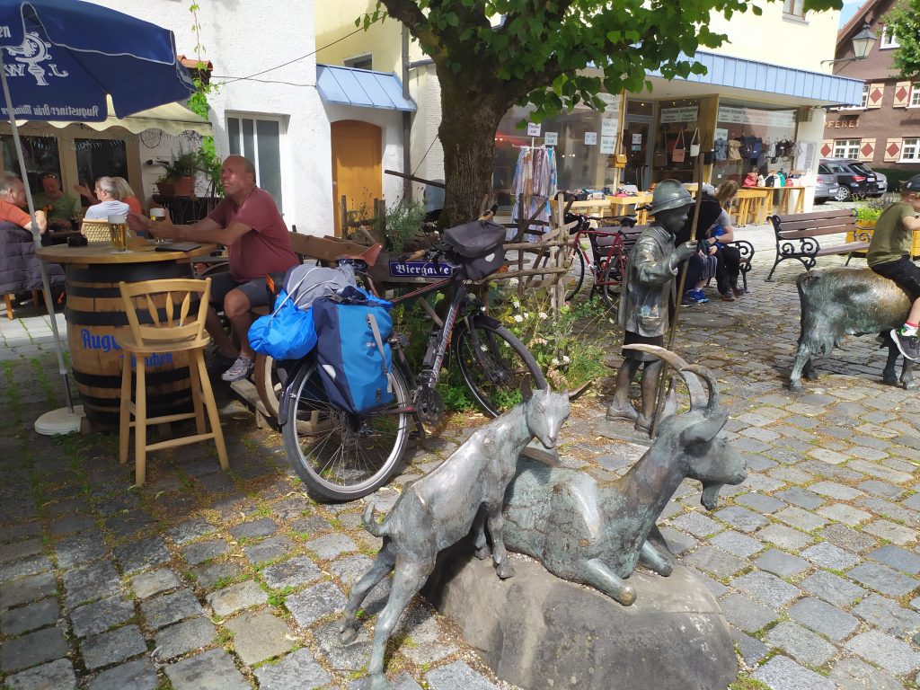 Nach einem ungemütlichen spartanischen Frühstück ging es zunächst gemütlich und ohne anstrengende Steigungen nach Lindenberg. Dabei auch einige Kilometer auf einem ehemaligen Bahndamm. Dann mehrere hundert Meter bergab ins Tal nach Weiler. Von dort ging es genauso steil wieder bergauf. Wir mussten eine große Strecke mühsam schieben und dann ging es teilweise im kleinsten Gang oder schiebend weiter bergauf. Um ein paar Kilometer zu sparen, fuhren wir weiter bergauf – bis zur absoluten Erschöpfung. Dann schön bergab oder flach bis nach Oberstaufen. Der Ort wirkt schon fast, wie in den Alpen. Sehr touristisch mit teuren Geschäften in der kleinen Einkaufsstraße. Der Rest (ca. 20km) bis Immenstadt ging immer leicht bergab durch das Tal. In Immenstadt noch eine kurze Bierpause. Die letzten 8km bis zum Haxenwirt in Thanners auch wieder bergab an der Iller entlang.