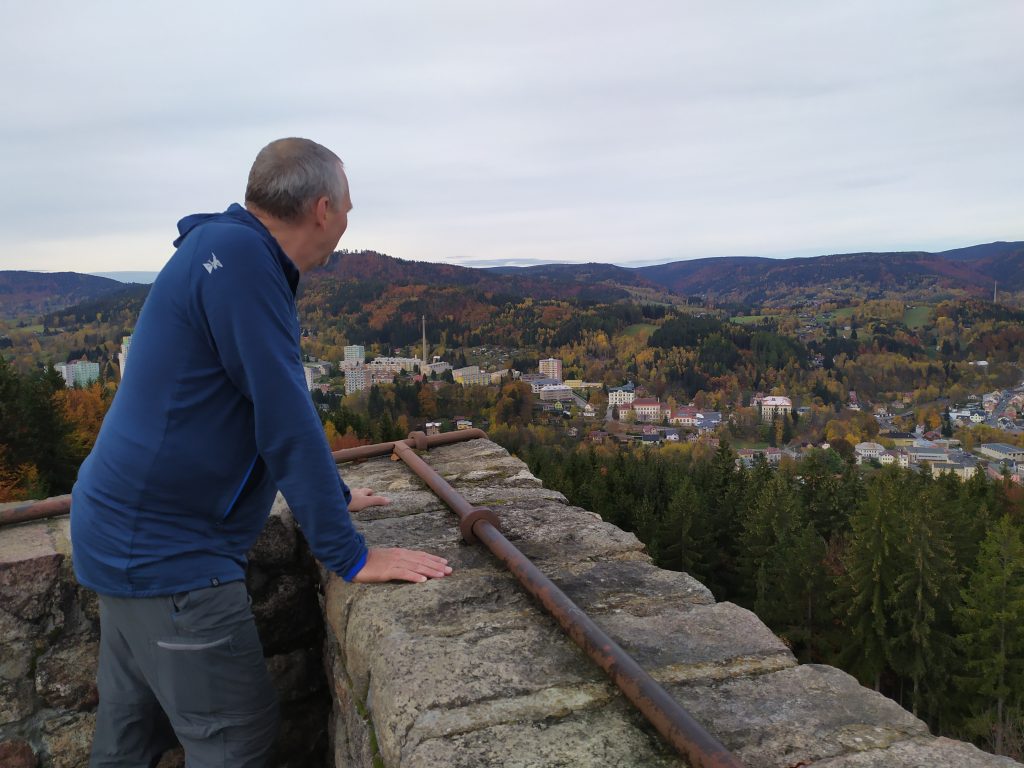 15,9 km, 510 hm, 5,5 Stunden, langsamer Aufstieg auf den Hausberg von Jablonec (Černa Studnice), Aussichtsturm erklommen, Pause mit einem Bier. Abstieg zunächst gemütlich, später mühseliger. Viele Felsen, über die der Wanderweg führte. Gegen 15 Uhr erreichten wir Tanvald und gingen erstmal Kaffee trinken und Kuchen essen. Hotel Grand hatte ein schönes, neu eingerichtetes Zimmer für uns, wirkte ansonsten etwas heruntergekommen. Das Abendbrot gab’s im Hotelrestaurant mit einer total verpeilten Kellnerin: zuerst brachte sie das falsche Bier (nahmen wir trotzdem), dann bekam ich einen Berg Fleisch (konnte ich nicht annehmen) und zum Schluss buchte sie sich statt 40 Kronen Trinkgeld 90 ab (wir gaben uns geschlagen)