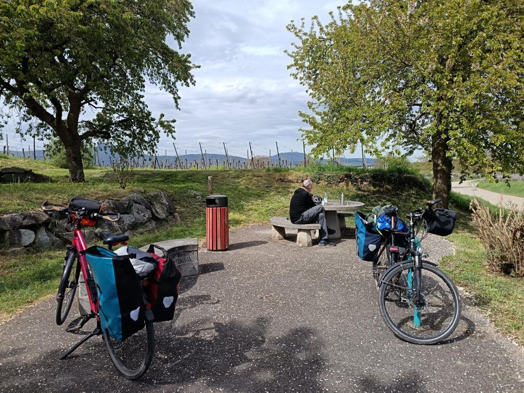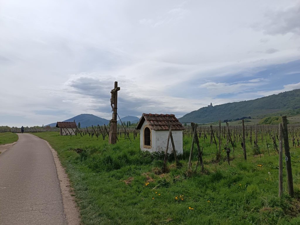 Als wir nach einem petit dejeuner (Hotelstyle) unsere Räder aus der Garage herausschoben, schien die Sonne. Zum ersten Mal seit wir unterwegs sind. Aber es hatte nur 5 Grad! Die Felder dampften! Das wurde besser im Laufe des Tages. Wir fuhren durch kleine Orte und kamen ins Elsässer Weinland. Der Eurovelo 5 führte uns auf der Weinroute entlang. Leider hatten wir nicht genügend Zeit, um uns die schönen mittelalterlichen Orte anzuschauen. So radelten wir z. B. nur an der Mossheimer Stadtmauer entlang. Andere Winzerdörfer durchquerten wir zumindest. Alles sehr traditionell hier. Die Fahrt durch die Weinberge war manchmal ziemlich anstrengend, aber bei dem Wetter auch sehr schön. Am Rande die Berge der Vogesen mit Burgen oben drauf. Gegen 17 Uhr erreichten wir Colmar, fanden unsere Ferienwohnung und sogar noch einen offenen Supermarkt.
