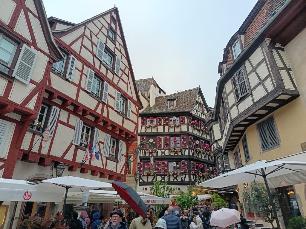 Zuerst gab’s Frühstück in der geräumigen ungemütlichen Ferienwohnung. Dann haben wir uns ins touristische Getümmel begeben. Die selfguided Tour, die wir im Netz gefunden hatten, war wenig informativ. Aber auch wegen der vielen Menschen und dem kühlen Wetter verloren wir schnell die Lust. In den pituresken mittelalterlichen Fachwerkhäusern gab’s jede Menge elsässische Spezialitäten zu kaufen. Alles sehr teuer.