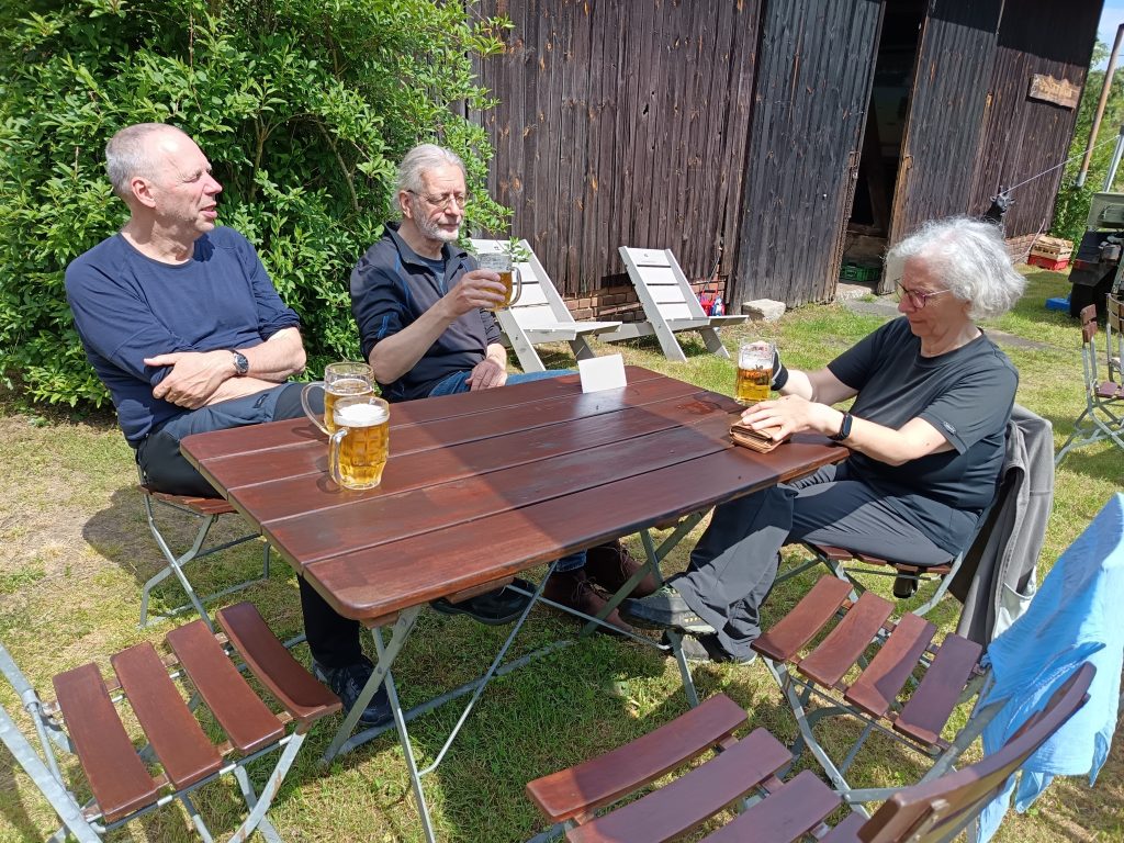 Es gab recht gutes Frühstück (leider ohne Tee) im Hostel. Wir sind bis Bad Muskau durchgeradelt, haben einen Blick auf das dortige Schloss und den Park geworfen und sind auf dem Marktplatz in die Bäckerei Dreißig eingekehrt. Nach Kaffee, Tee, Kuchen und Bockwurst ging es weiter nach Pusack zum Ziegenhof. B. musste teuren Ziegenkäse kaufen und es gab Bier und Radler vom Fass. Hier war die Neiße doppelt und wir überquerten beide Arme auf den Zelzer Brücken, denn unser Quartier lag wieder auf den polnischen Seite. Ca. 2 Km mussten wir ein Sandpiste überwinden, was vor allem für M. eine Herausforderung war. Wir erreichten Olszyna und unsere Truckerbleibe auf einem riesigen Autobahnparkplatz. Es gab einen Supermarkt und Raststätten-Abendessen.Wir saßen auf der Terrasse und spielten bis zum Dunkelwerden Wizard.