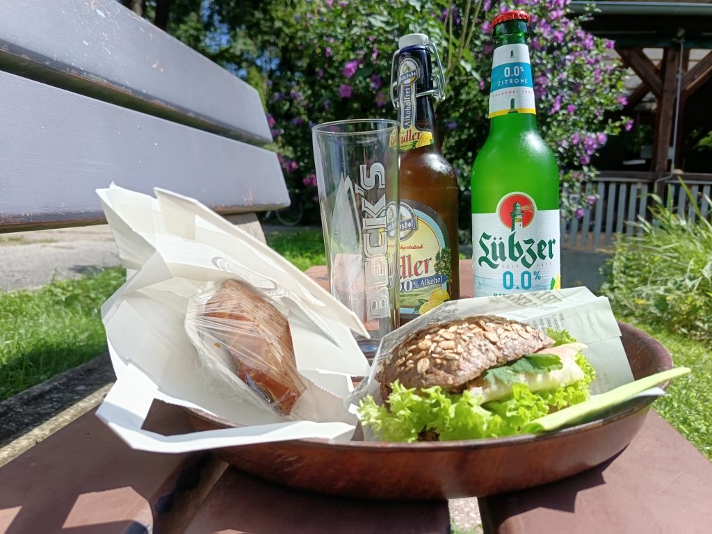 Die Paddeltour war kurz und führte uns über den Bützrhin und den Bützsee (nur kleine Wellen) zurück zum Ausgangspunkt in Altfriesack. Hier packten wir alles vom Boot auf die Räder und fuhren zum Fischer Mittag essen (in meinem Fall war es nur ein Getränk). Die Rücktour war identisch mit der Hintour, also erst durch den Wald mit Sandschieberei, dann Landstraßen, ruhige und weniger ruhige, aber letztere mit separaten Radwegen. Pausen in kremmen und Hennigsdorf. Halb sieben waren wir zu Hause und hatten keine Power mehr für’s Freiluftkino.