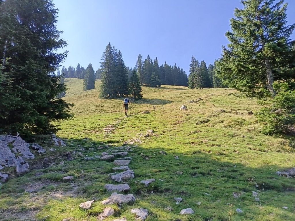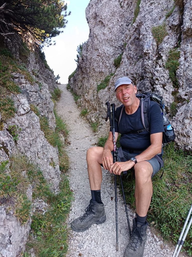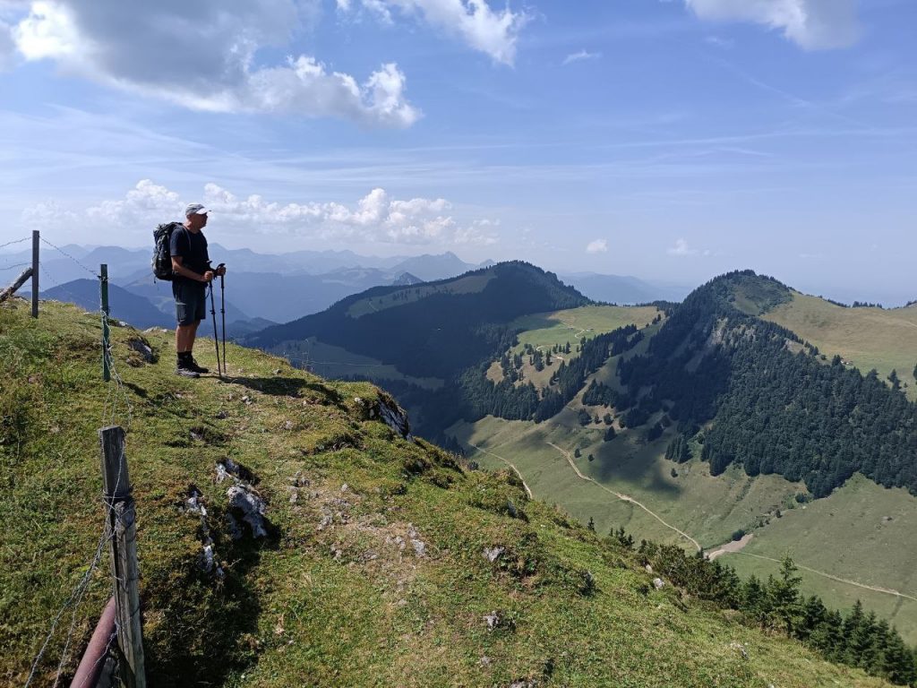 15 Minuten nach dem losgehen, ist uns eingefallen, dass wir Jans Regenjacke zum Lüften in den Trockenraum gehangen hatten. Mist! J. ging zurück und hatte am Ende des Tages 100hm mehr. Zwei Drittel der Strecke waren wunderschön. Kammwanderung, schöne Blicke in Täler mit Almen, viele Kühe. Das letzte Drittel war Kraxelei und hat uns zu schaffen gemacht. Um 16 Uhr waren wir am Ziel.