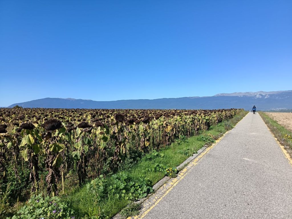 Um 9.45 Uhr waren wir auf der Piste. Gefühlt haben wir 2 Stunden aus Genf gebraucht und uns natürlich auch verfahren. Das lag aber nur an diesen komischen aufgemalten Radwegen. Der Umweg hat uns auch das erste Schieben eingebracht. Aber es folgten noch mehr…