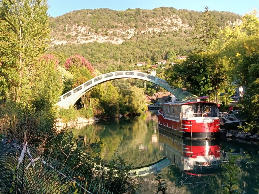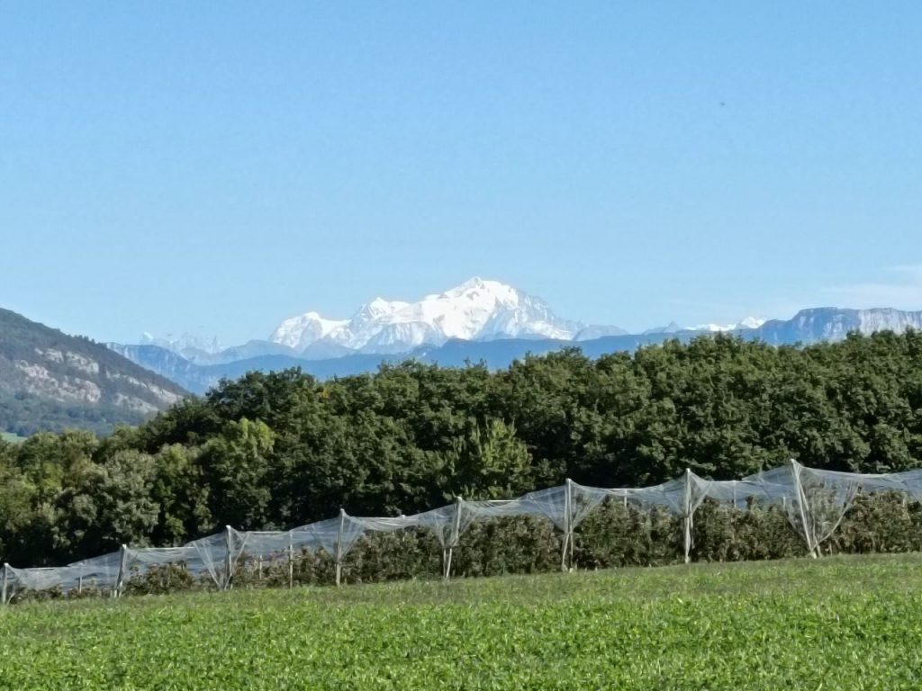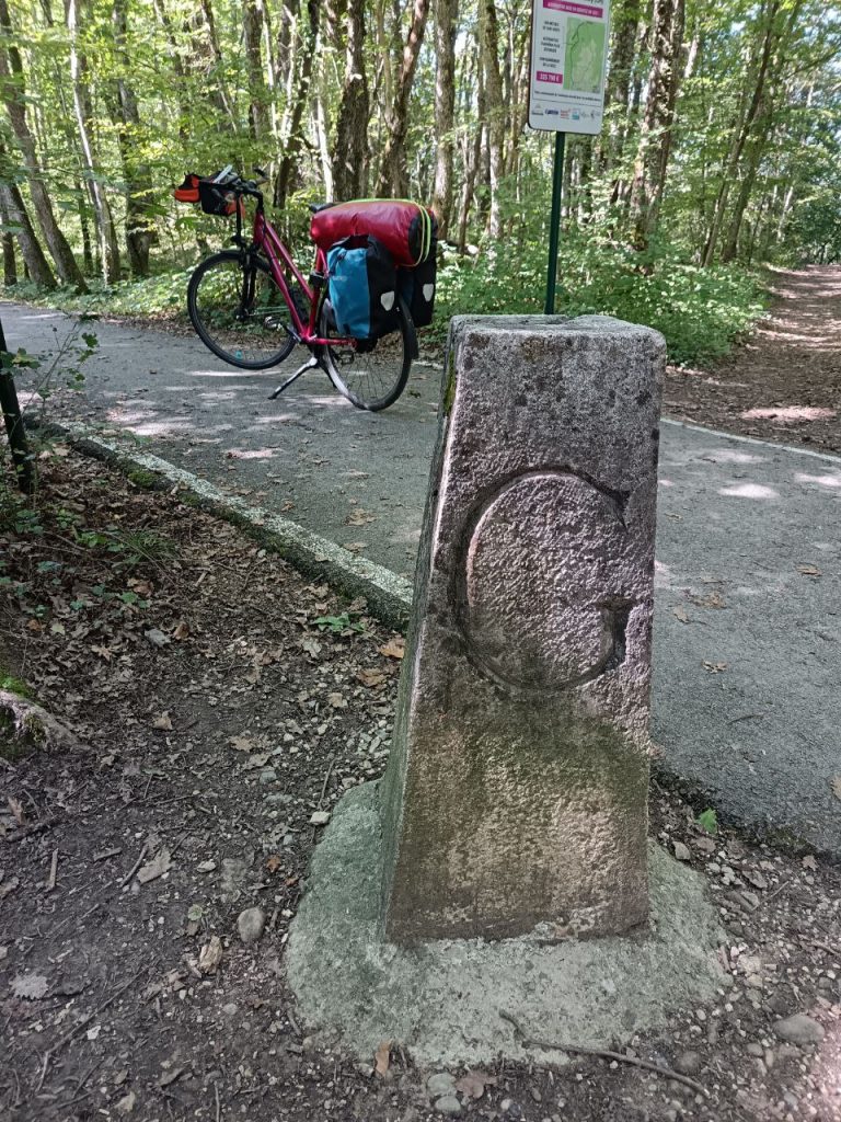 Insgesamt war es doch Recht bergig. Eine größere Steigung hatten wir noch vor der französischen Grenze und nach dem Rhone Durchbruch durch das Juragebirge. Das war auch ziemlich spektakulär: Weit unten der Fluss und eine Brücke. Meine Höhenangst konnte sich entfalten. Dann plötzlich hatten wir den vollen Blick auf den Mont Blanc in der Ferne und ganz in weiß.