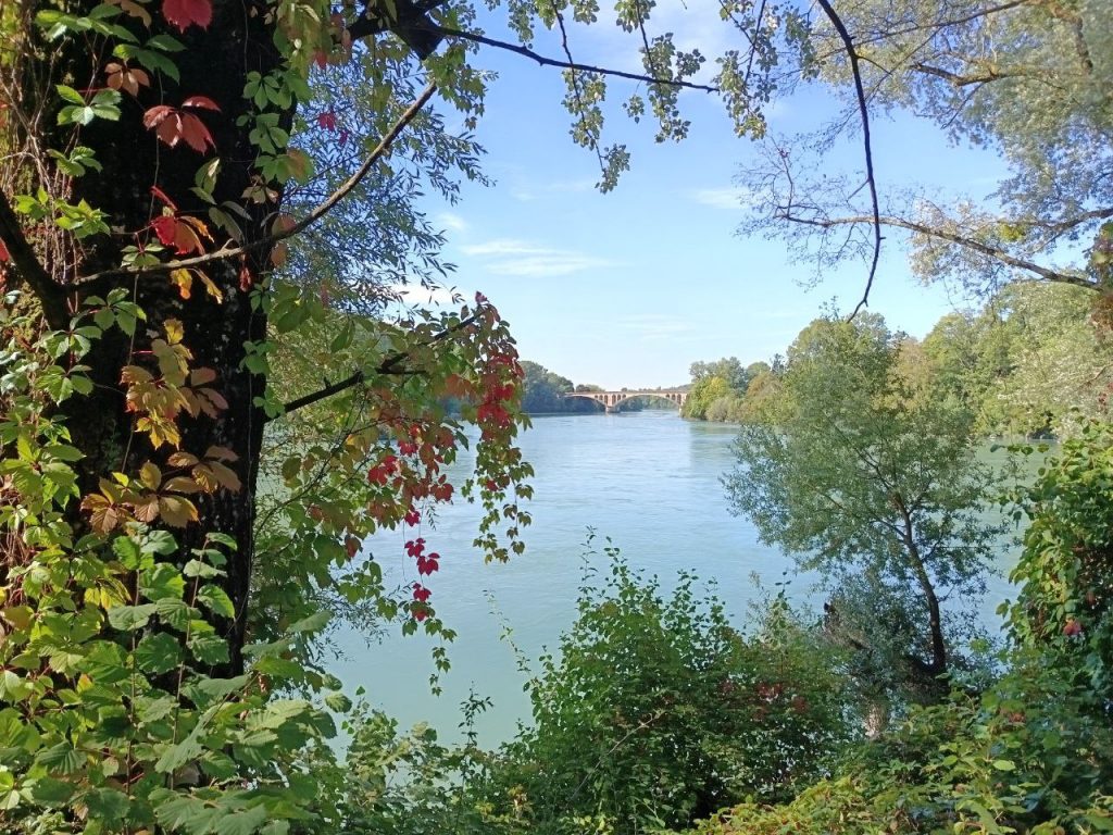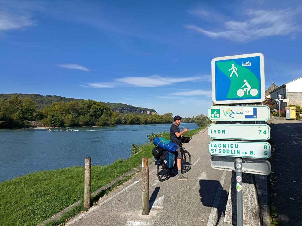 Die ersten 10 km hatten wir kräftig Rückenwind, danach kam er fast immer von vorn und es wurde wieder etwas hügeliger. Gegen Mittag machten wir eine kleine Trinkpause und merkten, dass wir schon leicht erschöpft waren. Aber 25 km vor Lyon verlief die Strecke an der Rhone entlang, meist windgeschützt und schattig. Wir sind bis in die Innenstadt auf diesem seperaten Radweg vor allem durch Parks gefahren.
