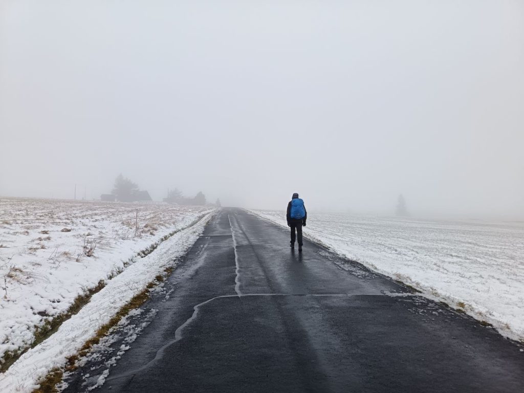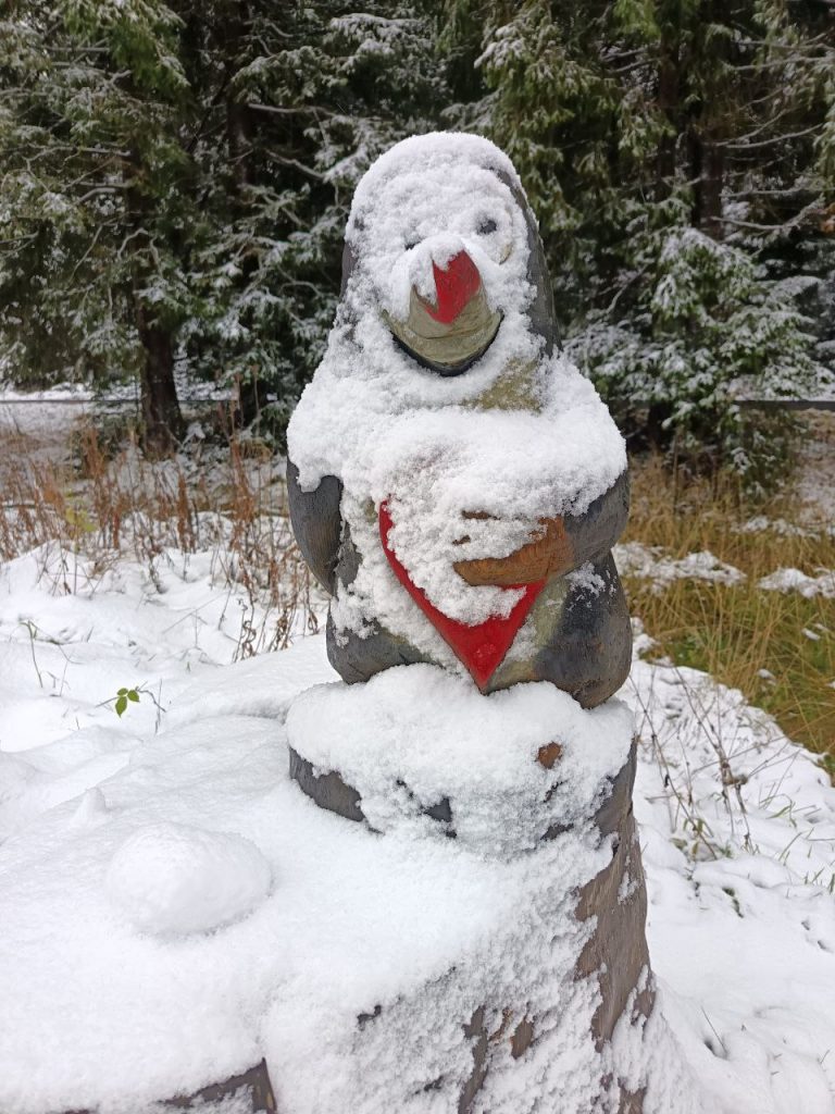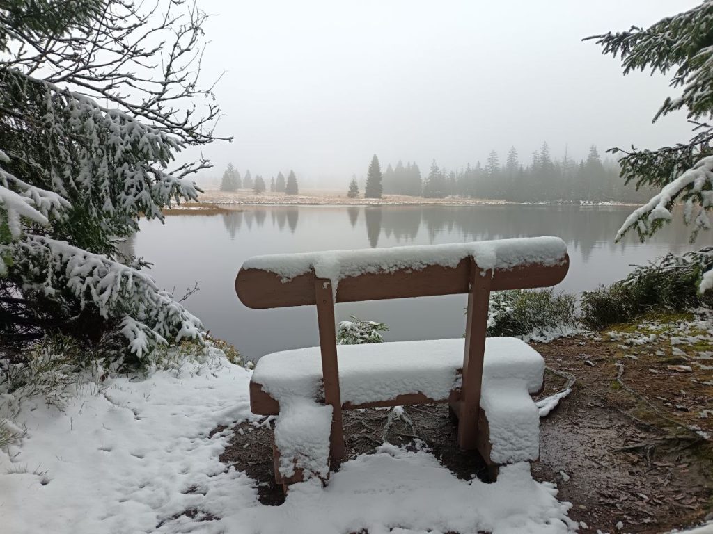 Unsere letzte Etappe auf dieser Herbst/Winterwanderung. Nach einem guten Frühstück im grünen Haus machten wir uns durch den Schneematsch auf den Weg. Im Wald war es richtig schön: Verschneite Bäume, unberührte Wege. Wir trafen einige Wandernde. Heute ist hier wahrscheinlich ein Brückentag zum morgigen Nationalfeiertag. Zwischendurch schneeregnete es, aber wir sind gut ausgestattet und unsere Schuhe und Klamotten hielten gut. Gegen 14 Uhr kamen wir in Horni Blatna an. Hier ist es viel verschlafener als in Bozi Dar. Nur eine Kneipe hat auf. Wir wohnen heute über dem vietnamesischen Lebensmittelladen. Eine sehr großzügige, moderne Ferienwohnung.