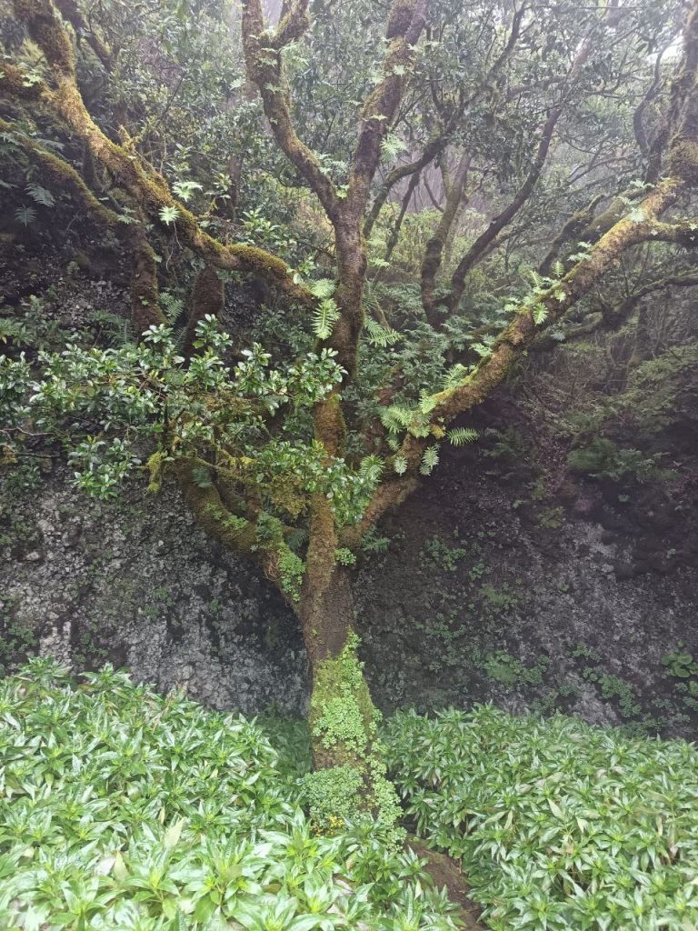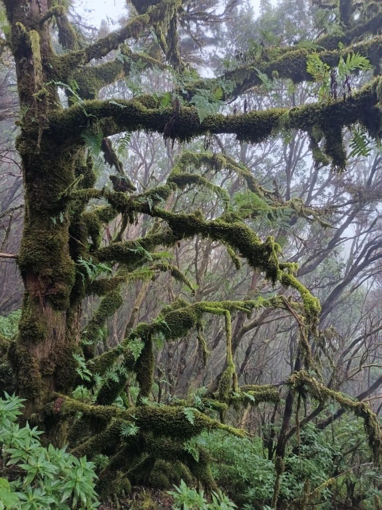 Heute sind wir in die Berge oberhalb von Valverde gewandert. Es war schon am Morgen windig und wolkig. Auf ca. 1000 Höhenmetern kamen wir in den Nebelregenwald der von den Wolken des Passatwindes gespeist wird. An den westlichen Berghängen nieselt es also ständig. Die krüppeligen Bäume sind fast vollständig mit Moos bewachsen und Farne und Sträucher sind nass.